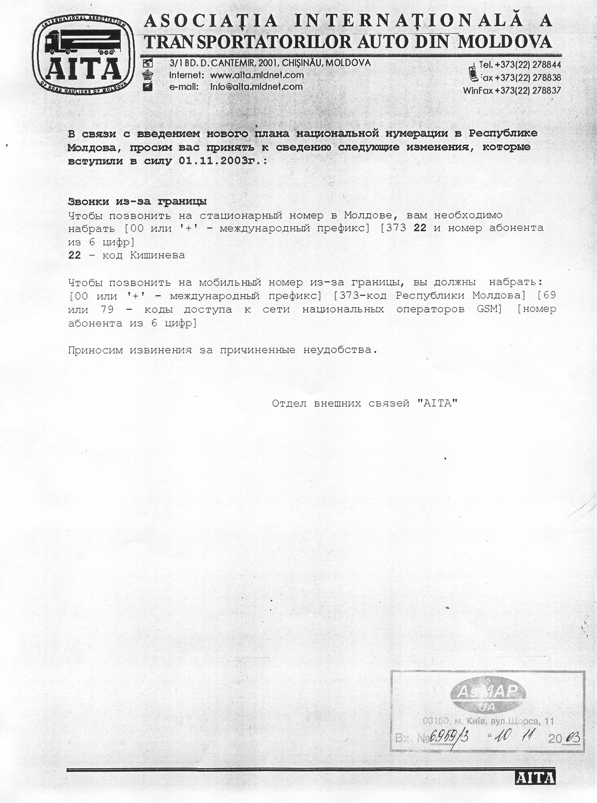 Информация для перевозчиков. Обратите внимание на изменения при дозвоне в Молдову.