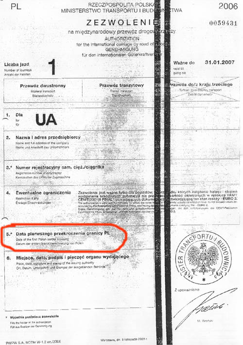 Доводимо до Вашого відома, що згідно листа Державного департаменту автомобільного транспорту від 12.01.06, при здійсненні обміну дозволів на 2006 рік, Міністерство транспорту та будівництва Республіки Польщі передало для використання українськими перевізниками бланки дозволів нового зразка.