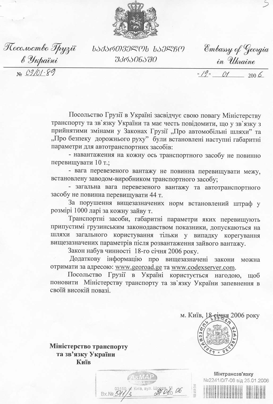 Посольство Грузії в Україні повідомляє, що у зв’язку з прийняттям змін до  Законів Грузії „Про автомобільні шляхи” та „Про безпеку дорожнього руху”  встановлено наступні вагові параметри для автотранспортних засобів: