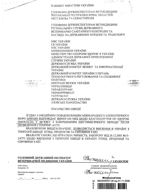 Державний департамент автомобільного транспорту надіслав копію листа Головного державного інспектора ветеринарної медицини України від 21.09.2006 року № 15-2/3374 щодо дозволу ввезення в Україну з території Швеції птиці, продуктів та сировини з неї.