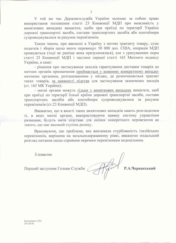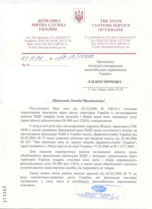 Асоціацією отримано лист Державної митної служби України № 11/2-19/13320 від 23.11.2006 року, яким надається роз’яснення положень зазначеного документу та порядок їх застосування.