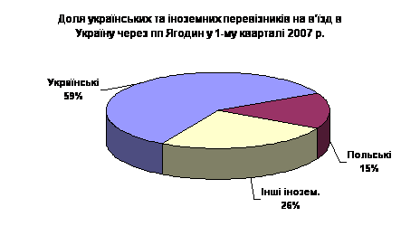 Серед загальної кількості автомобілів, що в’їхало в Україну у першому кварталі, на долю українських перевізників припадає 59 відсотків, на долю іноземних – 41 відсоток, у тому числі: польських – 15 %; інших – 26 %.