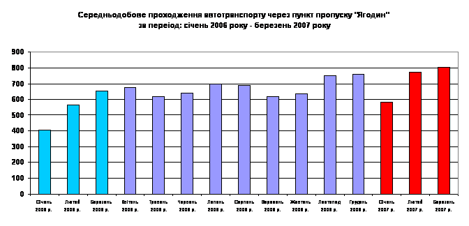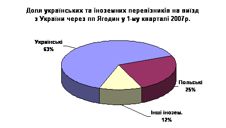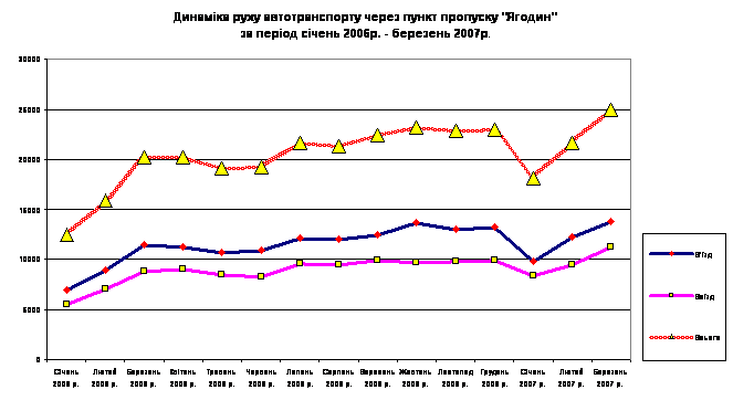 На виїзд з України протягом 1-го кварталу ц.р., також, спостерігалось збільшення кількості автотранспорту: у лютому – на 13 відсотків, у березні – на 34 відсотки у порівнянні до січня ц.р. У порівнянні до аналогічного періоду минулого року у 1-му кварталі 2007р. кількість автотранспорту, що виїхав з України через пп. «Ягодин» збільшилась на майже на 36 відсотків.