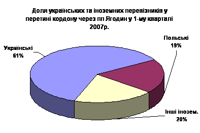 Серед загальної кількості автомобілів, що перетнули державний кордон України в пп. «Ягодин» у першому кварталі, на долю українських перевізників припадає 61 відсотки, на долю іноземних – 39 відсотків, у тому числі: польських – 19 %; інших – 20 %.