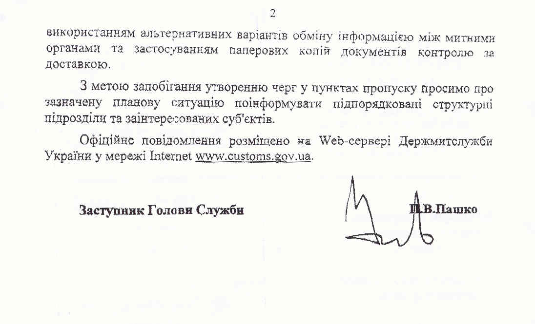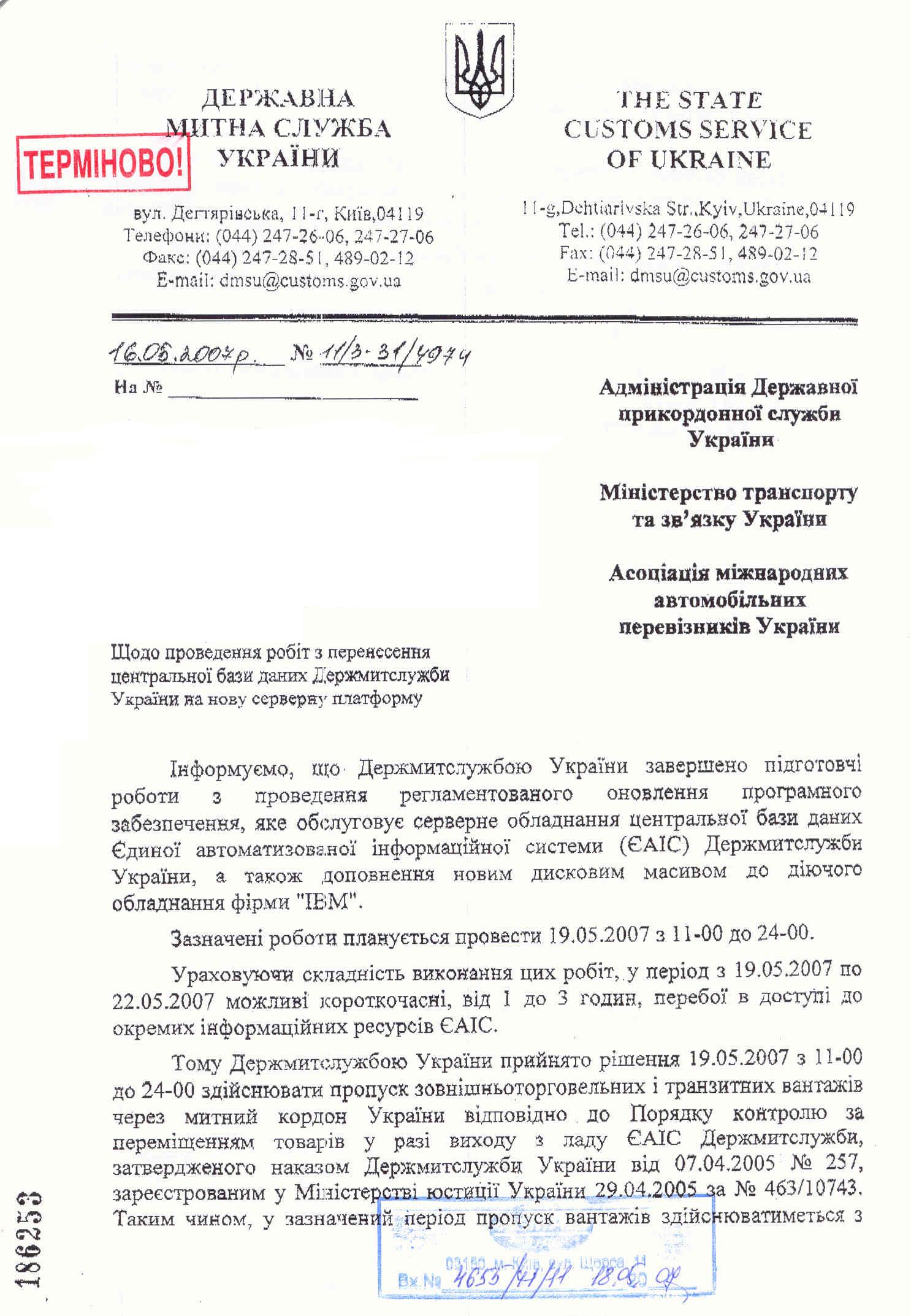 Згідно «Порядку контролю за переміщенням товарів у разі виходу з ладу ЄІАС Держмитслужби» (Наказ ДМСУ від 07.04.2005 р. № 257) 19 травня поточного року з 11 до 24 години пропуск зовнішньоторговельних і транзитних вантажів через митний кордон України здійснюватиметься із використанням альтернативних варіантів обміну інформацією між митними органами та застосуванням паперових копій документів контролю за доставкою.