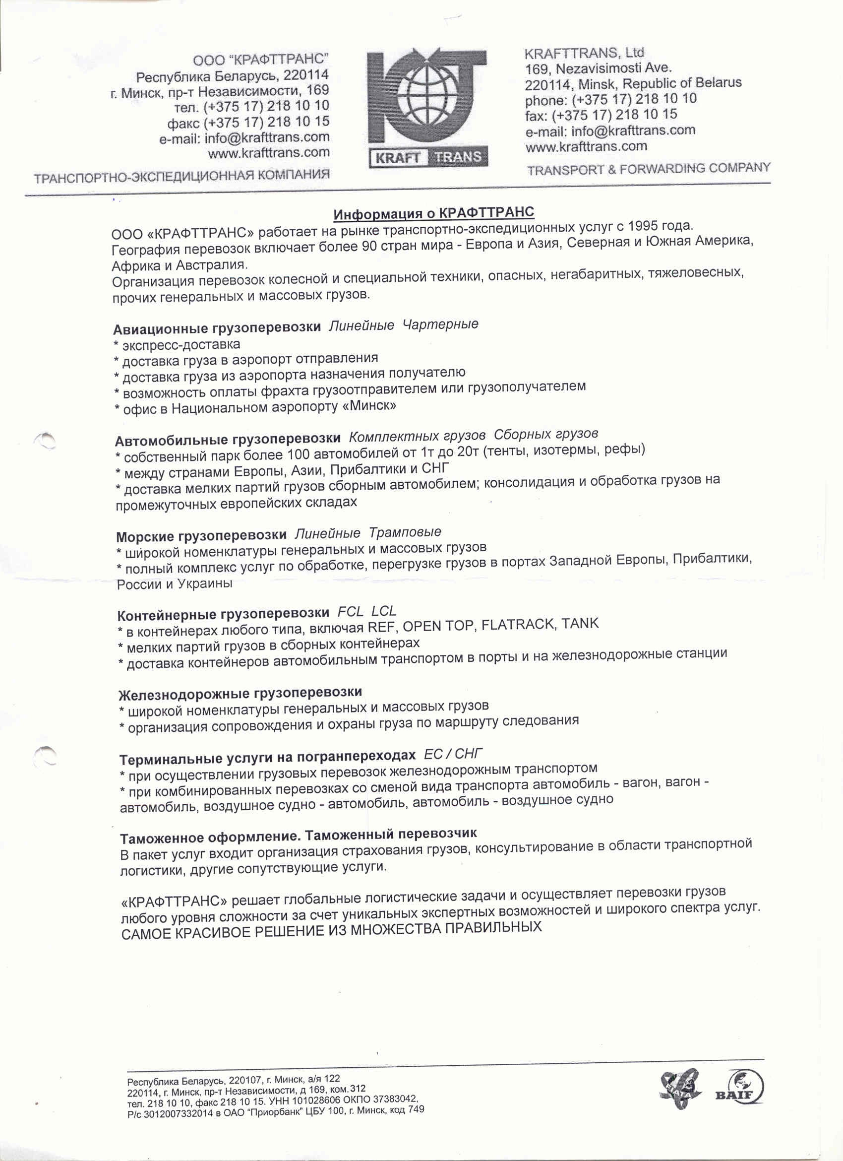 Щодо можливості ділового співробітництва з ТОВ «КРАФТТРАНС» (Республіка Білорусь)