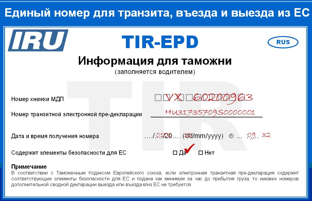 Інформувати співробітників митних органів ЄС про отриманий номер попереднього електронного повідомлення TIR EPD можна за допомогою наступної форми. Заповнений зразок подається нижче.