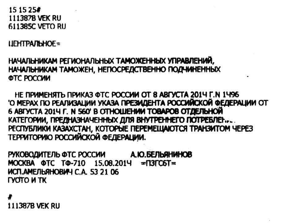 Відповідно до телеграми керівника ФМС РФ, Белянінова А.Ю., російські митні органи не повинні застосовувати зазначений наказ ФТС Росії по відношенню до товарів, призначених для внутрішнього споживання Республіки Казахстан, які переміщуються транзитом через територію Російської Федерації.