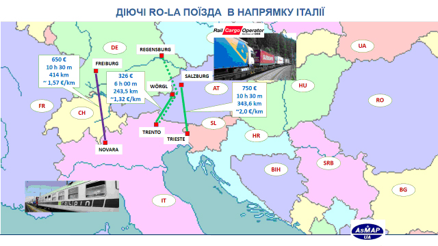 Для доставки вантажів автомобільним транспортом в/з Італії можливо здійснювати перевезення за альтернативними маршрутами з використанням RO-LA поїздів.
