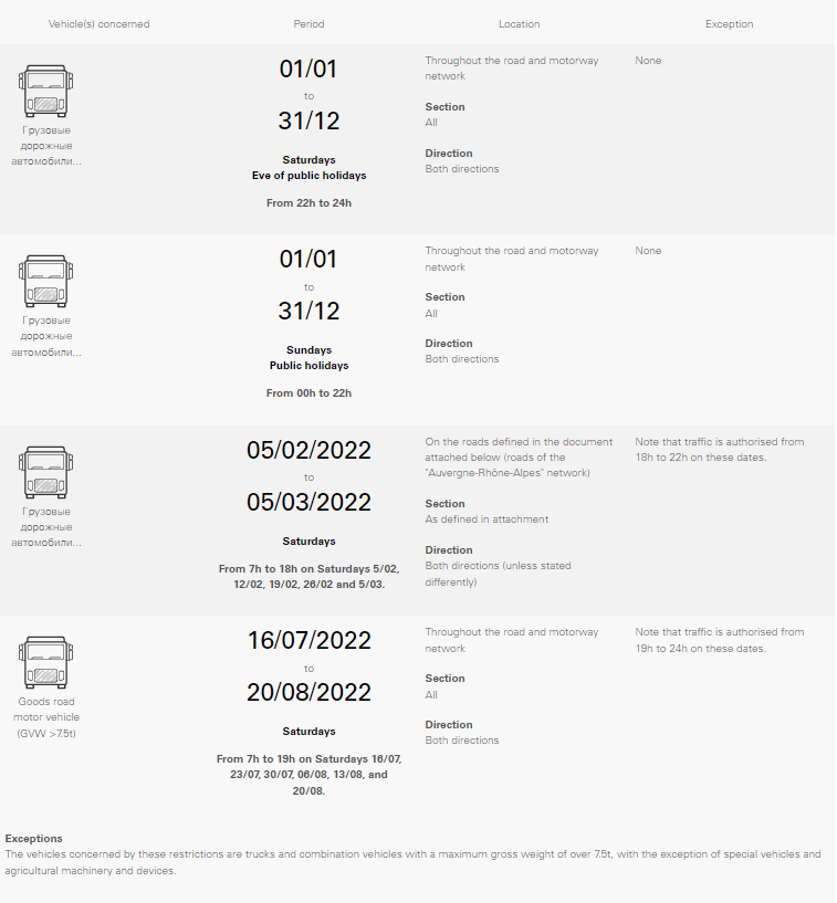 Додаткові заборони на рух у зимовий та літній періоди для вантажних транспортних засобів понад 7,5 тонн доступні за посиланням   .