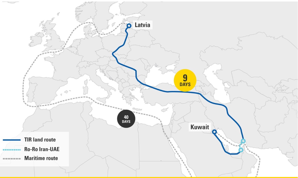 Товари вирушили з Латвії та пройшли транзитом через Литву, Польщу, Чехію, Словаччину, Угорщину, Румунію, Болгарію, Туреччину, Іран через порт Бандар-Аббас, а потім до Об’єднаних Арабських Еміратів на судні «Ro-Ro» і Королівства Саудівської Аравії, перш ніж прибути до місця призначення в Кувейті.