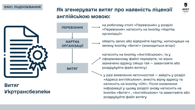 Укртрансбезпека нагадує, що відповідно до Угоди про лібералізацію вантажних перевезень з Європейським Союзом на борту вантажівки обов’язково має бути витяг про наявність ліцензії англійською мовою. Як згенерувати витяг про наявність ліцензії англійською мовою в особистому кабінеті ЄКІС ДСБТ? Алгоритм дій в інфографіці. Також звертаємо увагу, що термін дії витягу — 1 рік (з моменту генерації документа). Кількість сформованих витягів необмежена.