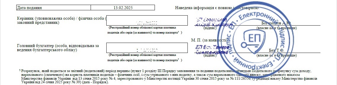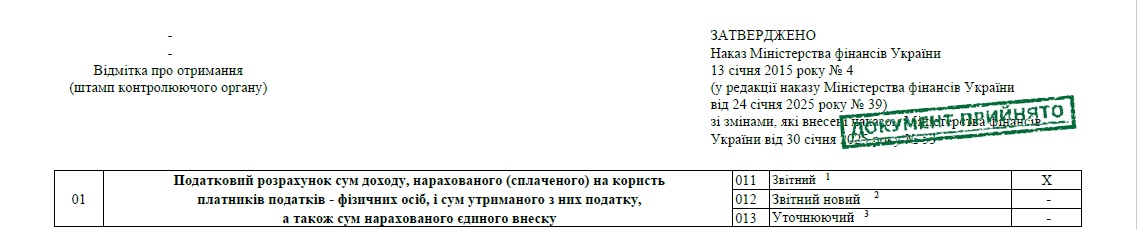 відомості щодо кількості застрахованих осіб - працівників - завірену копію Податкового розрахунку сум доходу, нарахованого (сплаченого) на користь платників податків - фізичних осіб, і сум утриманого з них податку, а також сум нарахованого єдиного внеску, форма якого затверджена наказом Міністерства фінансів України від 13 січня 2015 року № 4, зареєстрованим у Міністерстві юстиції України 30 січня 2015 року за № 111/26556 (у редакції наказу Міністерства фінансів України від 02 березня 2023 року № 113), за останній звітний період із підтвердженням контролюючого органу про прийняття цього Податкового розрахунку.