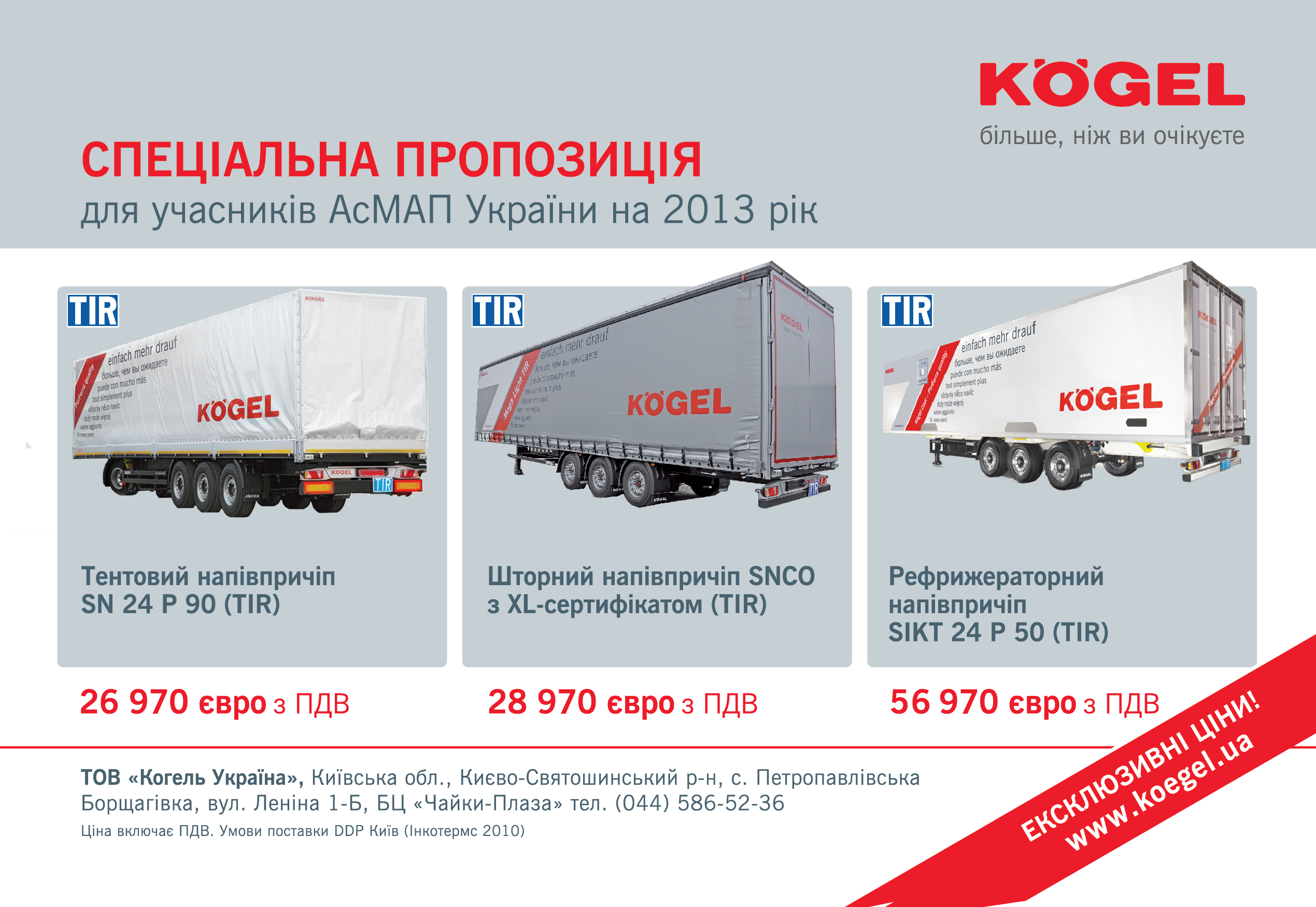 На 2013 рік було пролонговано дію спеціальної програми АсМАП та компанії «Kогель Україна» щодо оновлення рухомого складу перевізників. Вже третій рік поспіль наші учасники АсМАП мають можливість придбати нові сучасні напівпричепи за спеціальними умовами.